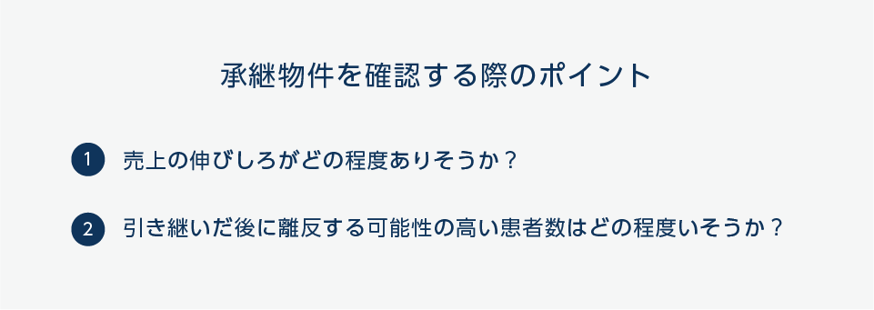 1)では売上や患者数を増やせる可能性について触れましたが、あわせて前院長から患者を引き継いだ際に離反してしまう可能性も視野に入れておく必要があります。