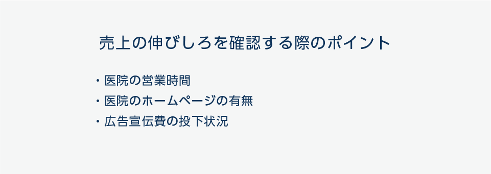 営業時間については、一般的な診療所と比較して診療日数が少ない状態になっていないか、午前診療のみなど診療時間を短くしていないか、という目線で確認することが重要です。