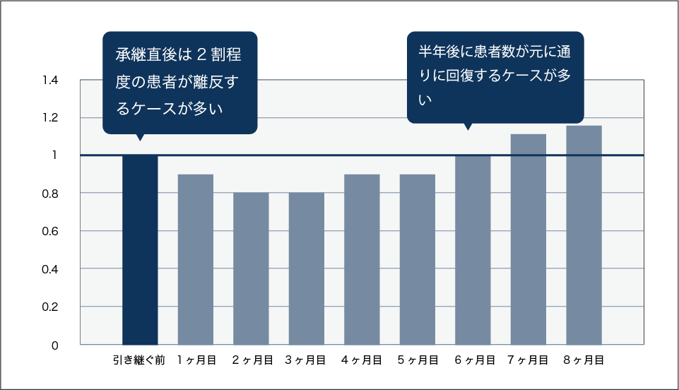 一般的には、医院を引き継いだ直後には、2割程度の患者が離反すると言われています。